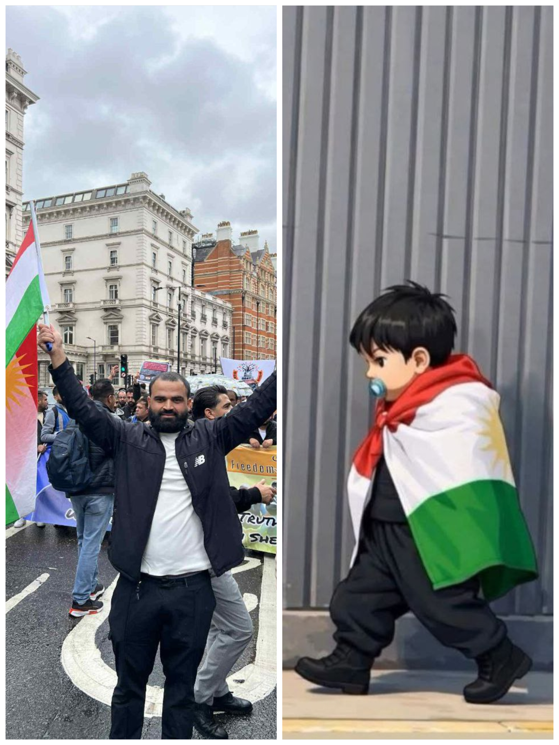 لەم وێنەیەدا، مێژوو بە جۆرێکی تر خۆی دەنووسێتەوە. منداڵێک دەبینین کە هێشتا زمانی بۆ گۆکردنی ناوی “نیشتمان” ڕانەهاتووە، بەڵام هەنگاوەکانی مانا و شکۆی نیشتمان دەڵێنەوە. ئەمە تەنها وێنەی کۆرپەیەک نییە؛ ئەمە وێنەی ئیرادەی تێکنەشکاوی نەتەوەیەکە کە لە ناو بێشکەوە فێری بەرگری دەبێت.​ئەم منداڵە دوو ساڵ و نیوە، بەو مەمکە مژەیەی ناو دەمی، پێمان دەڵێت کە ئەو هێشتا لە تەمەنی یاری و نازدایە. لەهەمان کاتیشدا ئامدەی چەک هەڵگرتنە بۆ بەر بری لە نیشتیمانەکەی و  بە ئاڵاکەی سەرشانی پەیامێکی توند بۆ دوژمنان و جیهان دەنێرێت: “ئێمە نەوەیەکین، پێش ئەوەی فێری نان خواردن ببین، فێری عەشقی خاک و نیشتمان دەبین.ئەو بە تەنها دەڕوات، بەڵام هەزاران ساڵ مێژووی لەپشتە. هەر هەنگاوێکی، دەنگدانەوەی هاواری ئازادییە بۆ کوردستان. ئەو دەیسەلمێنێت کە، خاک یەکە، بۆ ئەو، سنوورە دەستکردەکان بوونیان نییە؛ ئاڵاکەی سەر شانی هەموو کوردستانە، بە بەرائەتی مناڵانەی خۆی بە هەموو جیهانی ووت، داهاتوو لە دەستێکی ئەمیندایە، نەوەی نوێی کورد، نەوەی “تەسلیمبوون” نین، ئەو کەس فێری نەکردووە چۆن لە پێناو نیشتماندا بڕوات ئەگەرچی بە تەنها ش بێت، بەڵام خۆڕسکانە بە غەریزەی کوردایەتییەوە بەرەو مەیدانی شەرەف هەنگاو دەنێت.​ئەمە عەشقی نیشتمانە؛ کە لە شیری دایکەوە دەستپێدەکات و لە ئاڵایەکدا دەبێتە ناسنامەی هەتاهەتایی.